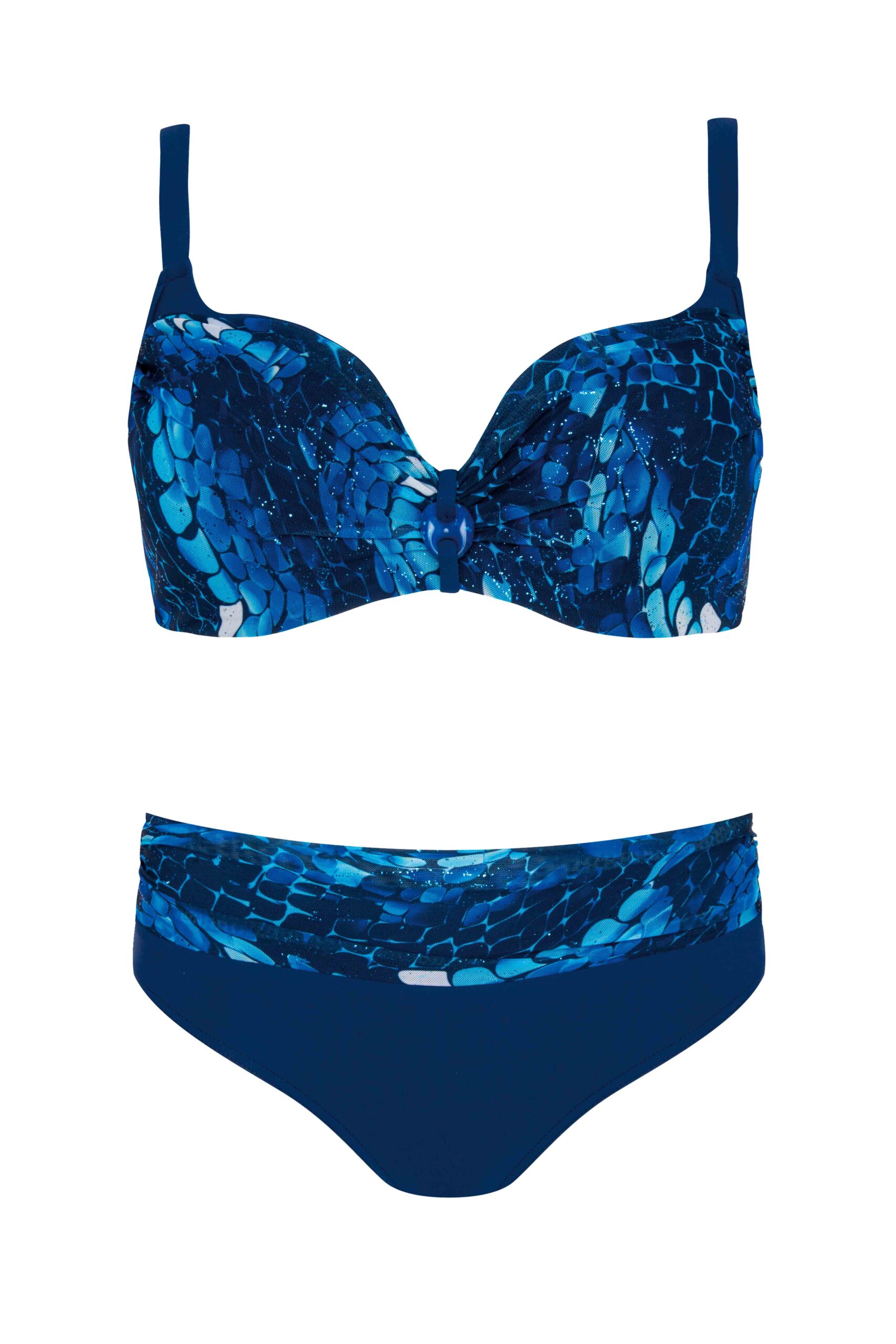 Adriatic 2 – S940V1AD2, które łączy kobiecość z odważnym designem. Biustonosz z głębokim dekoltem pięknie eksponuje sylwetkę i podtrzymuje biust, a perfekcyjnie skrojone figi zapewniają wygodę. Wyrazisty wzór w odcieniach granatu sprawia, że model wyróżnia się na tle plażowych stylizacji.