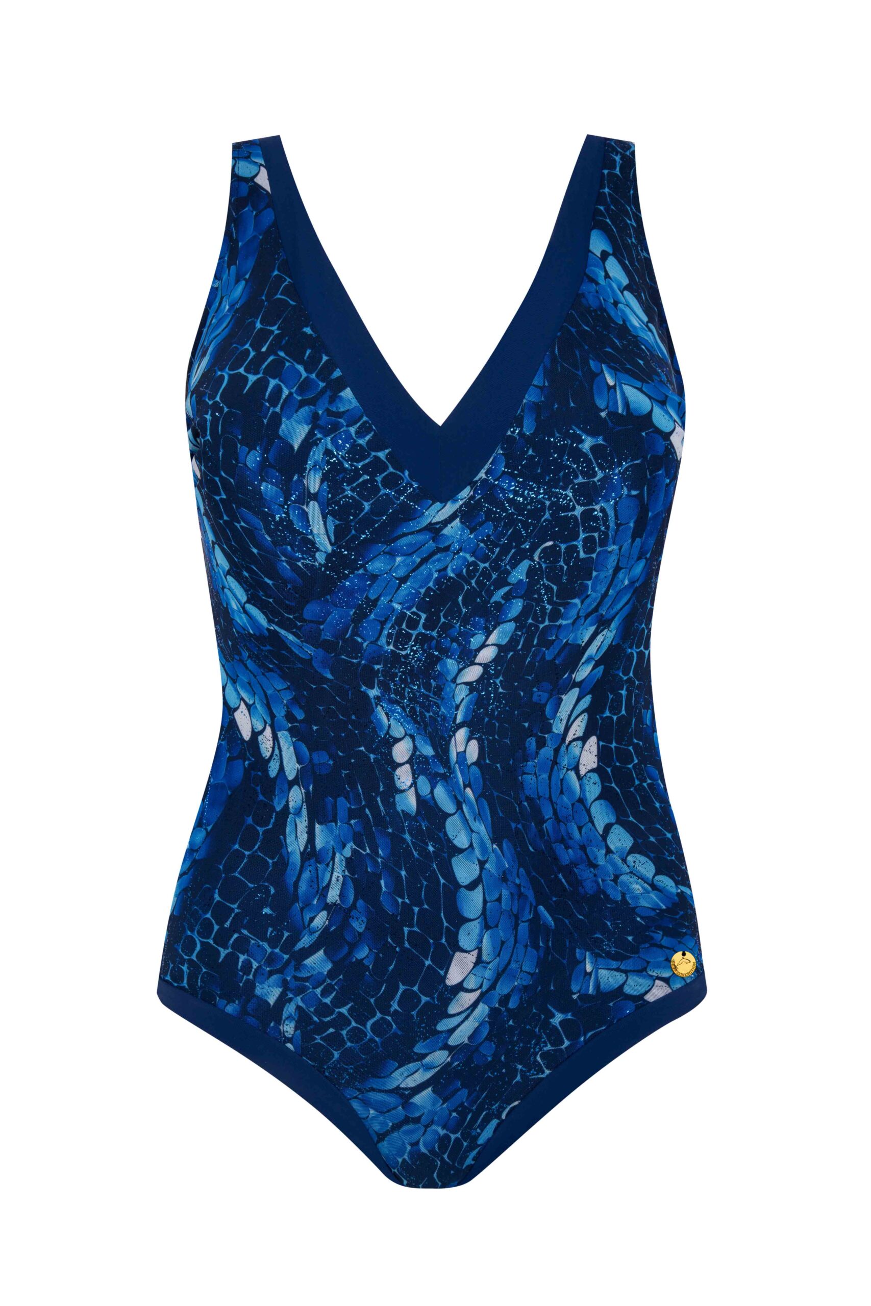 Elegancki kostium jednoczęściowy z drapowaniami i siateczkowymi wstawkami, które wysmuklają talię. Model zaprojektowany, by podkreślać atuty sylwetki i dodać jej wyrafinowanego charakteru. Drapowania i transparentne wstawki tworzą efekt optycznego wyszczuplenia, a głębokie odcienie granatu inspirowane morzem podkreślają elegancję. Doskonały wybór dla kobiet kochających luksusowe detale.