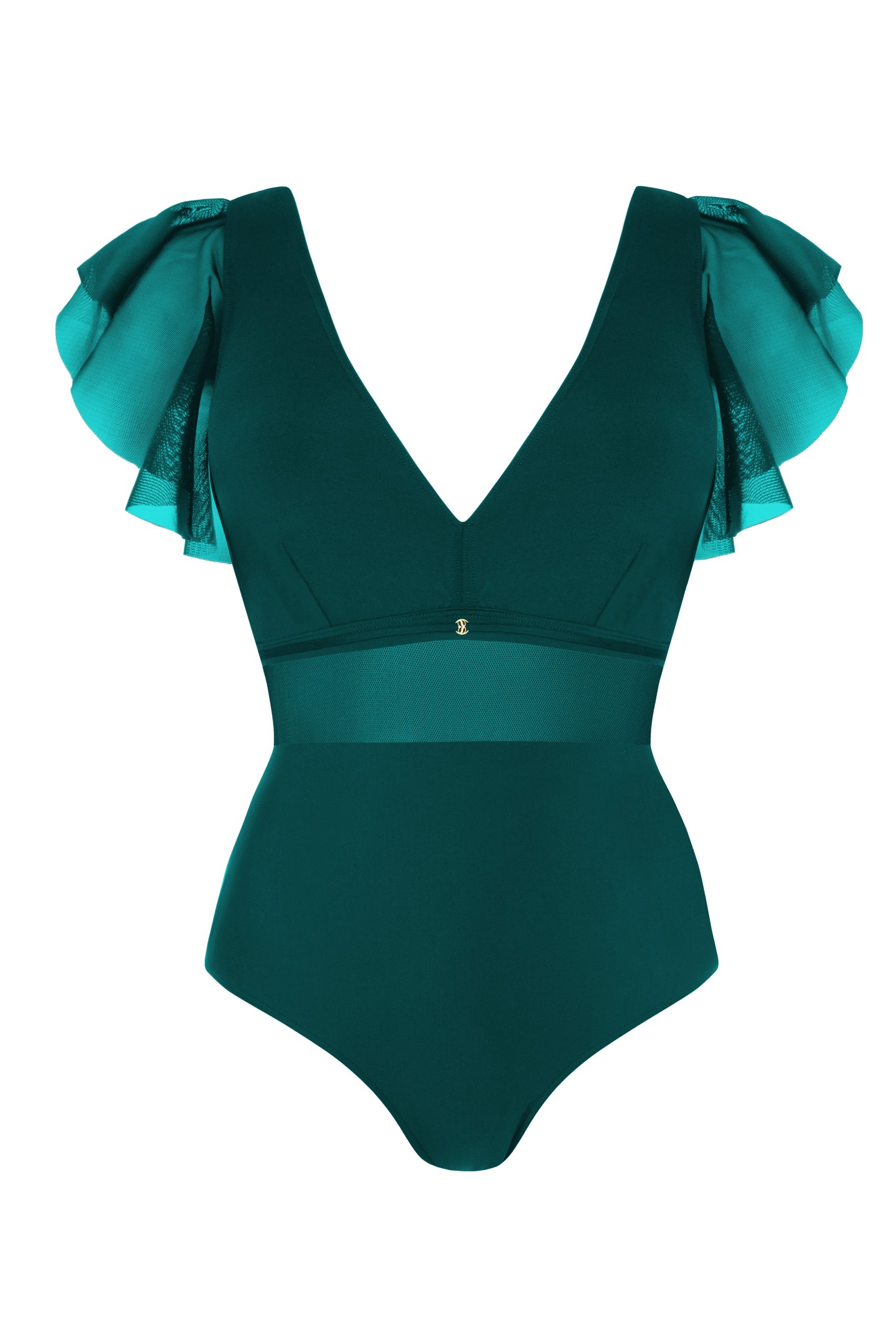 Kostium został zaprojektowany z myślą o kobietach, które cenią sobie wygodę i styl. Posiada wyjmowane wkładki, dzięki czemu można dopasować go do indywidualnych potrzeb. Na podszewce, w przodzie z eleganckim cięciem i przezroczystą siatką pod biustem, model ten pięknie eksponuje biust. Dodatkowo, głęboki dekolt przodu oraz tyłu wysmukla sylwetkę, a delikatne, fantazyjne rękawy z ozdobnej siatki dodają całości lekkości i uroku.