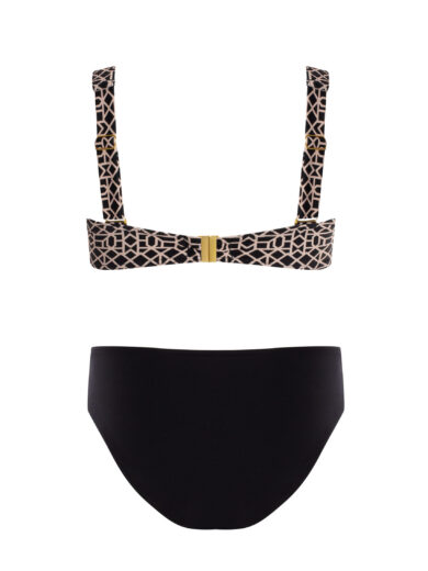 Dostępny w dwóch wariantach kolorystycznych – czarnym geometrycznym wzorem na beżowym tle oraz beżowym geometrycznym wzorem na czarnym tle, kostium ten sprawdzi się zarówno dla pań ceniących klasykę, jak i dla tych, które lubią wyróżniać się z tłumu.