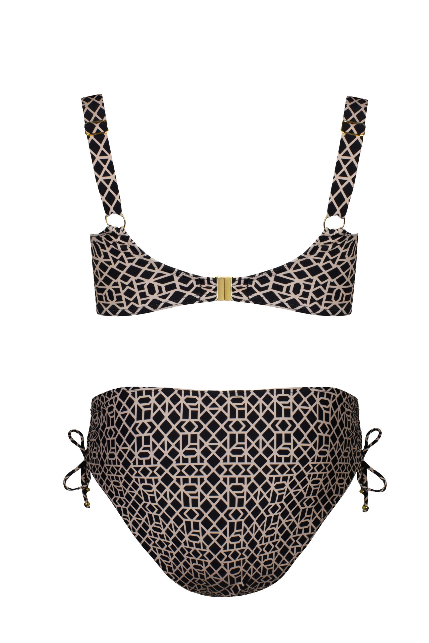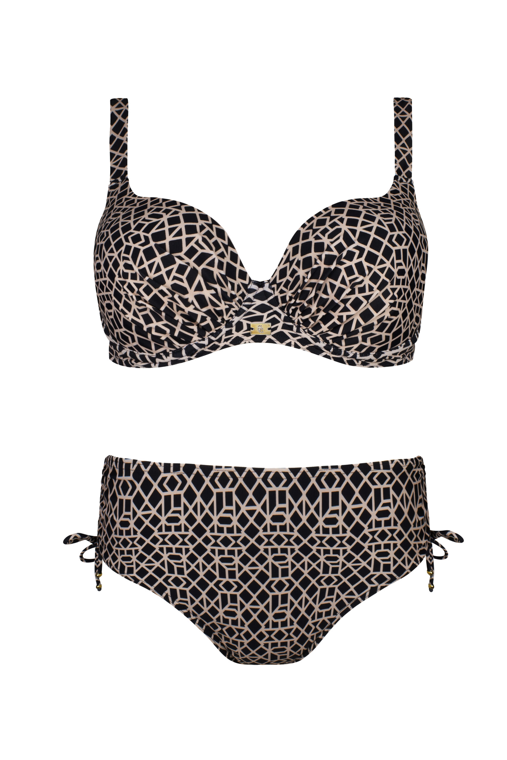 Dostępny w dwóch wariantach kolorystycznych – czarnym geometrycznym wzorem na beżowym tle oraz beżowym geometrycznym wzorem na czarnym tle, kostium ten sprawdzi się zarówno dla pań ceniących klasykę, jak i dla tych, które lubią wyróżniać się z tłumu.