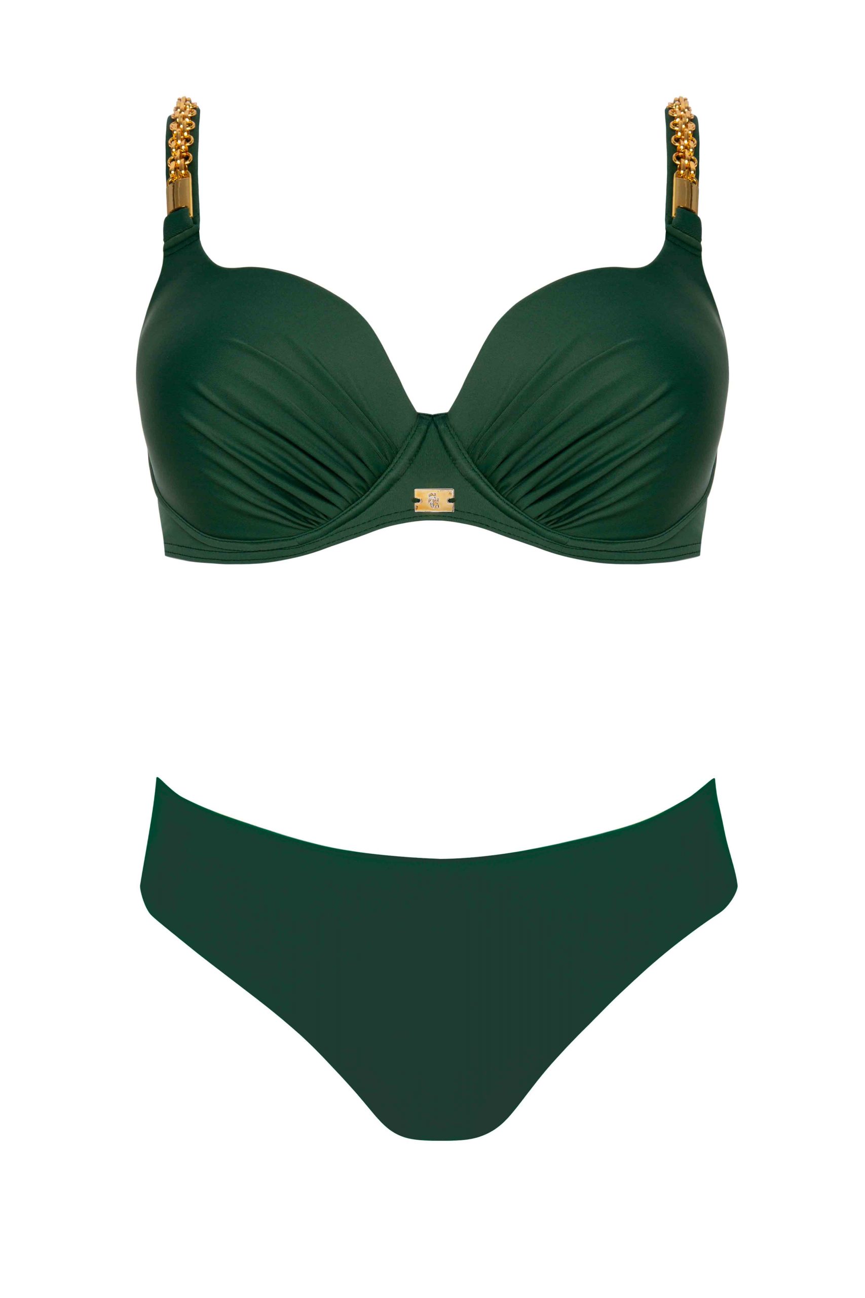 Ozdobne ramiączka z detalem w postaci złotego łańcuszka podkreślają elegancki styl modelu.