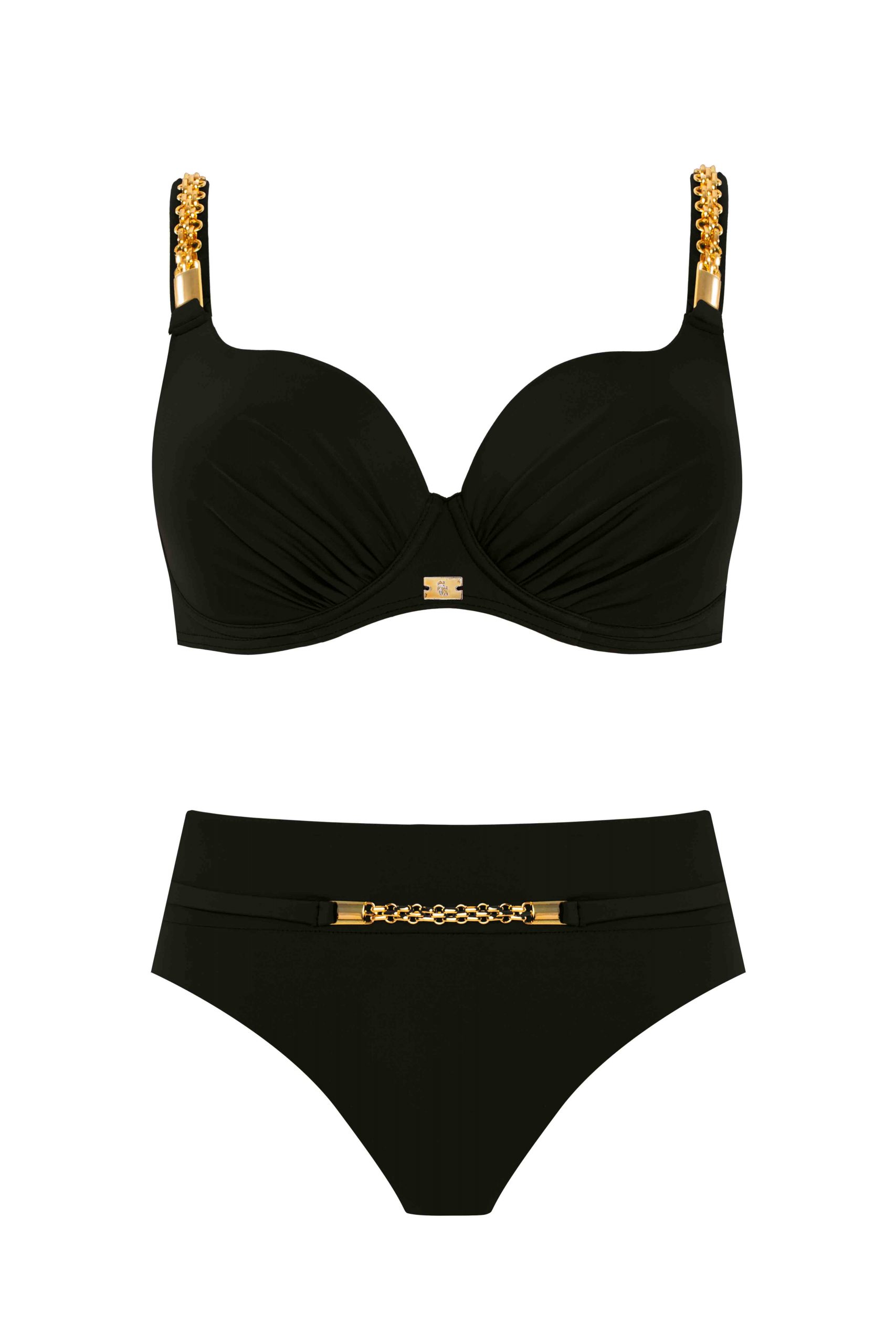 Ozdobne ramiączka z detalem w postaci złotego łańcuszka podkreślają elegancki styl modelu.