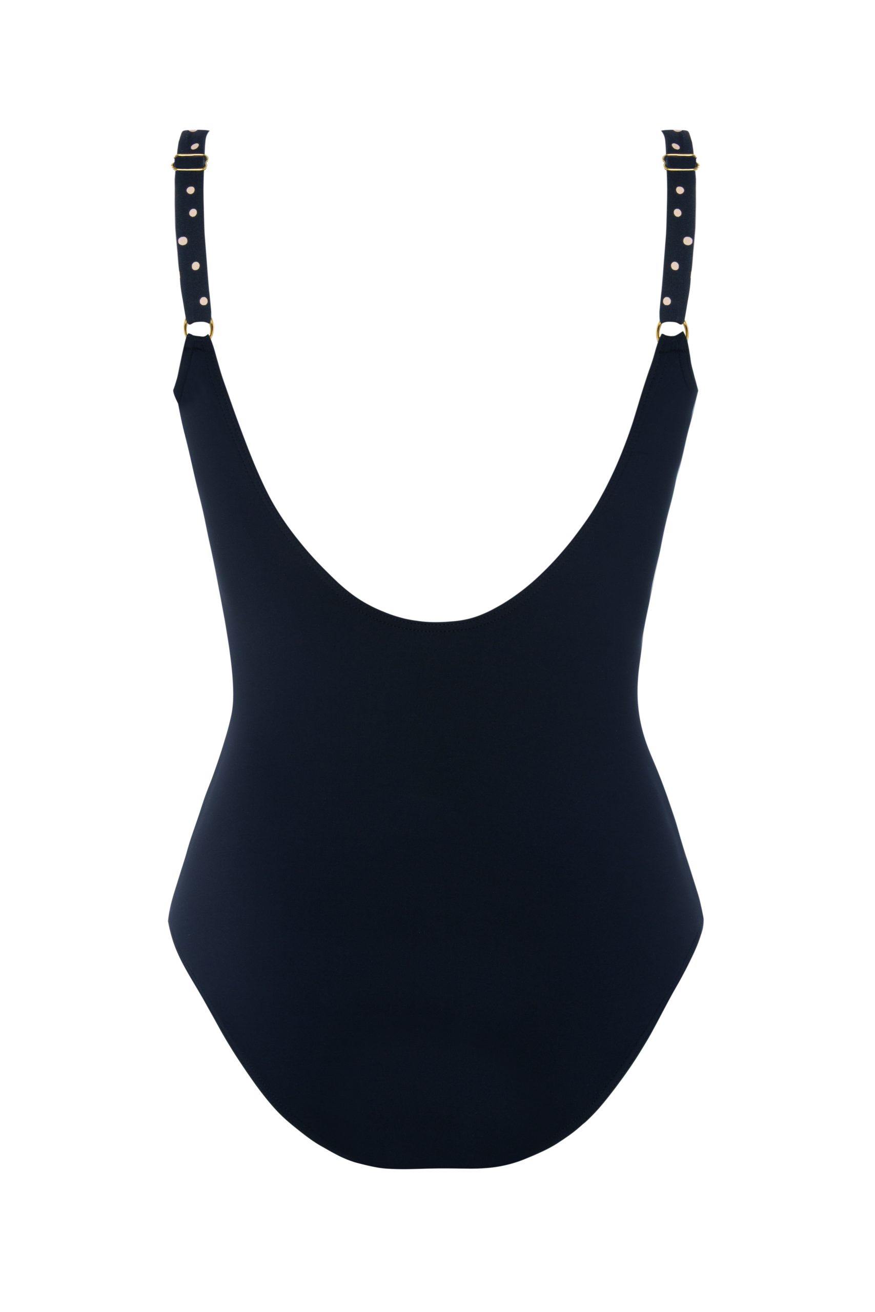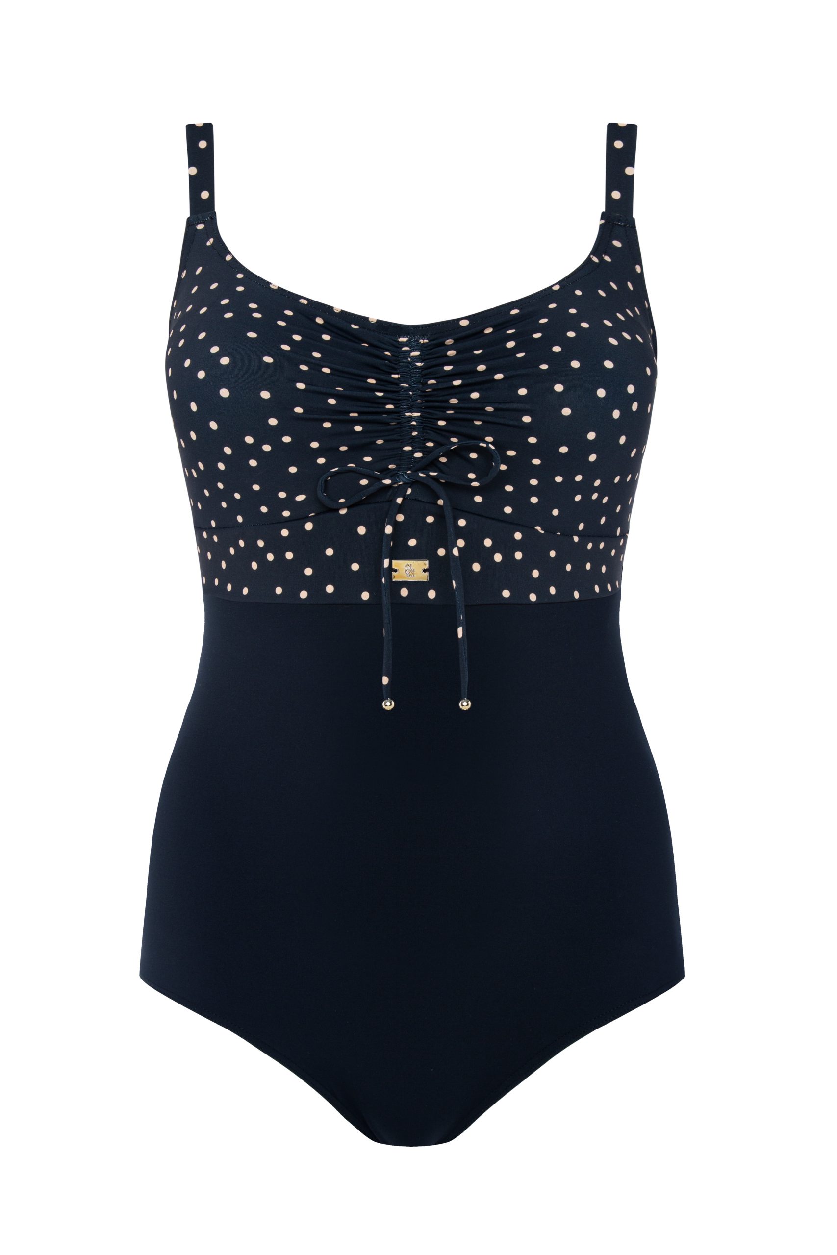 Model o sportowo-eleganckim charakterze z subtelnym marszczeniem na środku biustu. Góra kostiumu pokryta jest drobnymi ecru groszkami na granatowym tle, a gładka dolna część optycznie wysmukla sylwetkę. Wbudowane usztywniane miseczki nadają biustowi naturalny, ładny kształt. Na przodzie znajduje się delikatna ozdoba w postaci wiązania z troczkami, co dodaje modelowi lekkości i uroku. Kostium zapewnia wygodę oraz doskonałe dopasowanie, sprawdzi się zarówno na plaży, jak i na basenie.