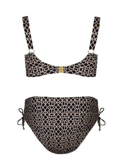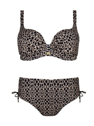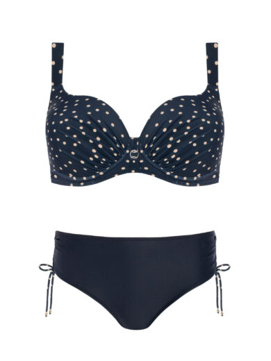Stylowy model z usztywnianymi miseczkami, które pięknie modelują biust i podtrzymują go nawet podczas aktywności. Dekolt zdobi subtelny groszkowy deseń w odcieniu ecru na granatowym tle, a gładkie elementy dodają harmonii całej sylwetce. Figi o klasycznej linii zapewniają wygodę i idealne dopasowanie. To elegancki, kobiecy zestaw o uniwersalnym charakterze, który świetnie sprawdzi się na plaży i przy basenie.
