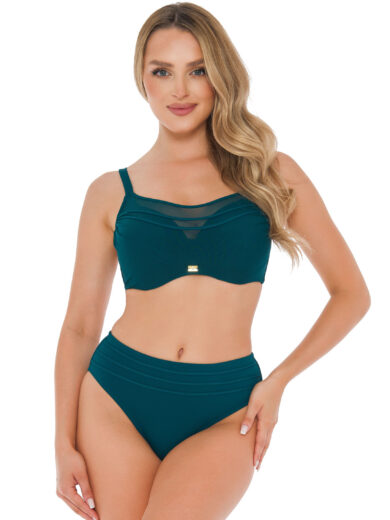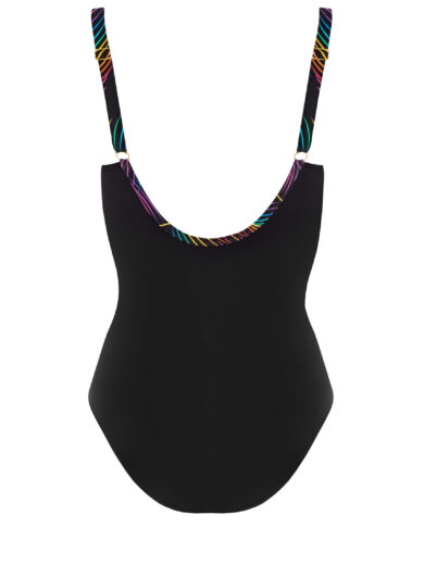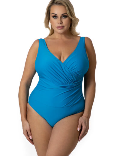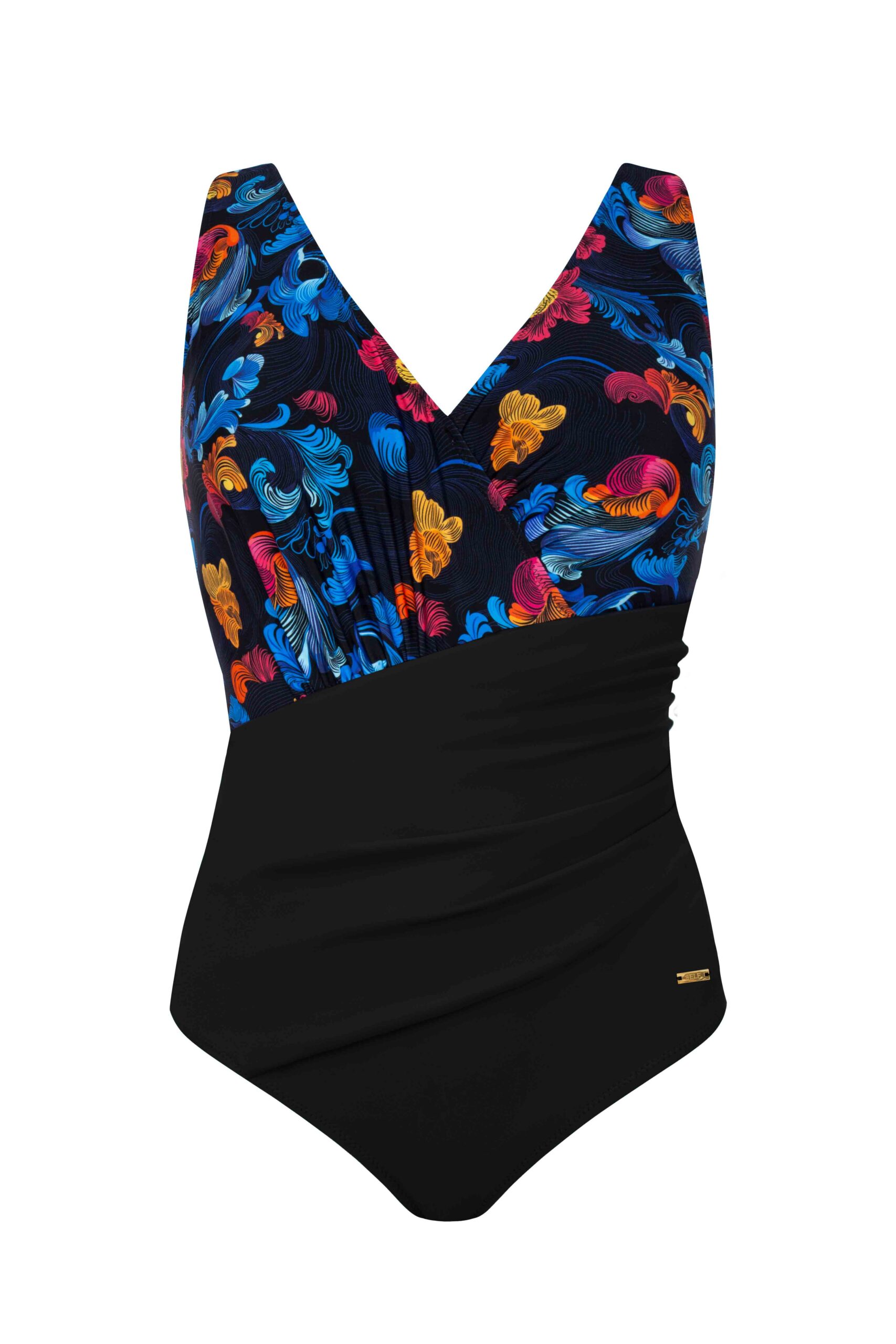 Jednoczęściowy kostium o klasycznej, kobiecej linii z głębszym dekoltem w serek. Przód ozdobiony jest drapowaniem i marszczeniem, które maskuje ewentualne niedoskonałości brzucha, jednocześnie podkreślając talię. Wzór w kwiaty na czarnym tle dodaje stylu i elegancji, a wbudowane usztywniane miseczki zapewniają komfort i odpowiednie podtrzymanie biustu. Model idealny dla kobiet poszukujących połączenia klasyki, wygody i delikatnego efektu modelującego sylwetkę.
